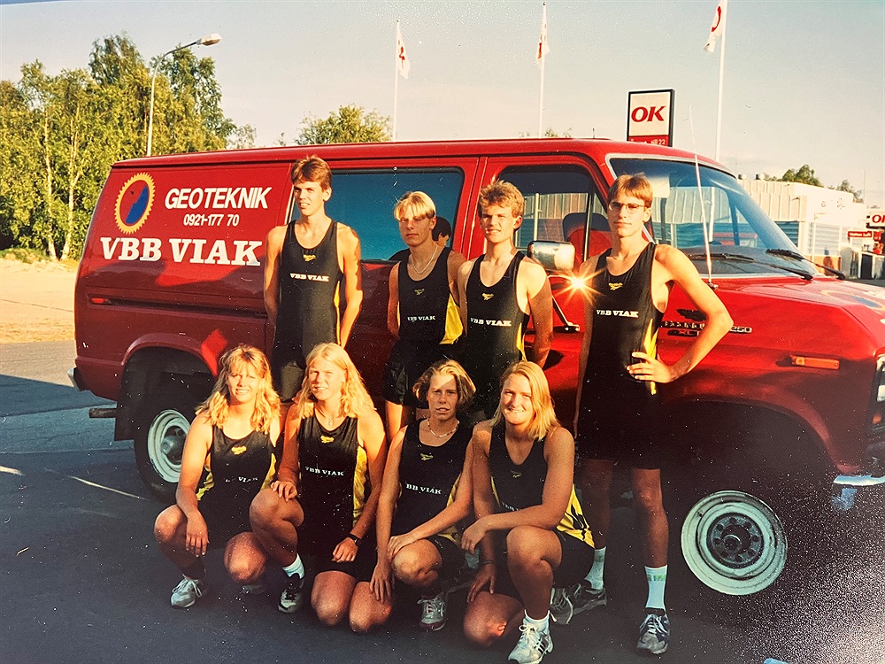 Som den skarpögde redan har lagt märke till står det VBB Viak på både bilen och tävlingsdräkterna och det ena har förstås med det andra att göra. Detta år hade klubben, liksom många andra klubbar i Sverige, skaffat nya dräkter av märket Reebok. Att det förhöll sig på detta vis berodde på att Reebok dels sponsrade svenska friidrottsförbundet sedan sommaren innan och i ytterligare tio år framåt, dels för att Reebok gjorde en rejäl satsning på friidrott vid just den här tiden. Veckan efter att den här bilden togs arrangerades EM i Helsingfors och många var de länder, förutom Sverige då, som sprang runt i likadana om än olikfärgade kläder av samma märke.
